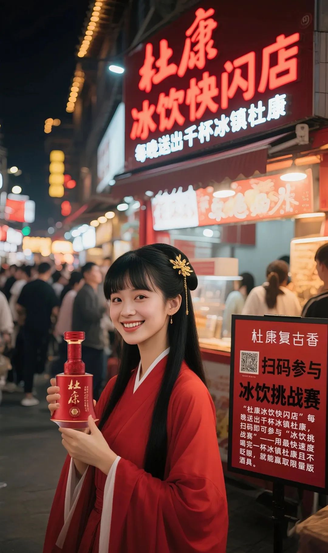 在广东佛山夜市,“杜康冰饮快闪店”每晚送出千杯冰镇杜康,扫码即可参与“冰饮挑战赛”——用最快速度喝完一杯冰镇杜康且不眨眼,就有机会赢取限量版酒具。活动现场,一位身着汉服的美女惊艳四座:“这哪里是喝酒,分明是在品尝穿越千年的清凉!”